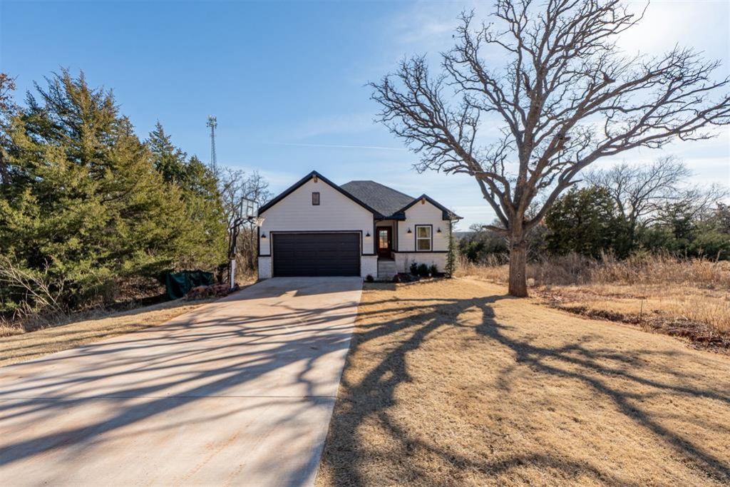 Built in 2023, this 4-bedroom, 3-bath home in Arcadia offers a walk-out basement, no HOA, Edmond Schools, 2 car attached garage, covered patio, and sweeping countryside views less than 12 minutes from I-35 and major interstate access. Elevated above the surrounding landscape, the property captures panoramic, tree-filled views with no neighboring buildings in sight, creating rare privacy and a sense of space that feels far beyond the lot size. The main level features an open-concept living area with a gas fireplace and large windows everywhere that frame the scenic backdrop. The kitchen includes granite countertops, generous cabinetry, and seamless flow into the dining and living areas, ideal everyday living. The private primary suite is located on the first floor and offers a peaceful retreat with beautiful views, while an additional bedroom and full bath provide flexibility for guests or a home office.The walk-out lower level expands the living space with two additional bedrooms, a full bath, and a versatile flex area perfect for a second living room, media room, or workout space. An unfinished basement area offers valuable storage and future potential without adding to the official square footage. Situated on an elevated interior lot with city water and sewer, this home combines the quiet feel of country living with convenient access to Edmond shopping, dining, and Arcadia's growing small-business community. Enjoy open land views, neighboring horses in the distance, and seasonal sunsets that make this setting truly special. With newer construction, functional layout, scenic views, and a prime location near Edmond, this property delivers exceptional value and long-term appeal.