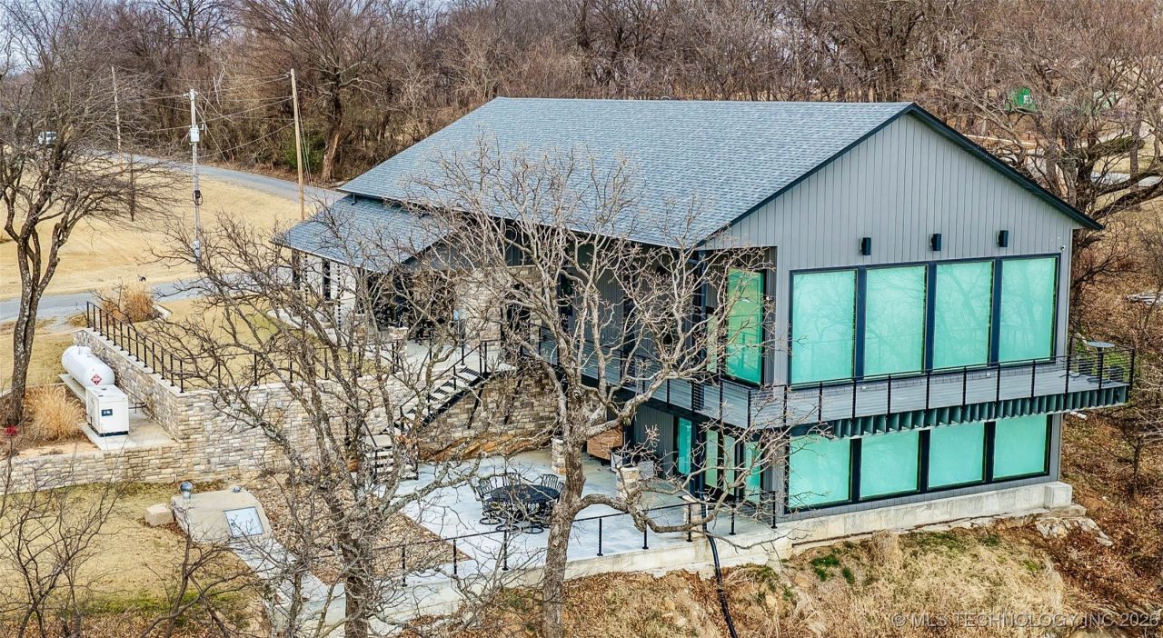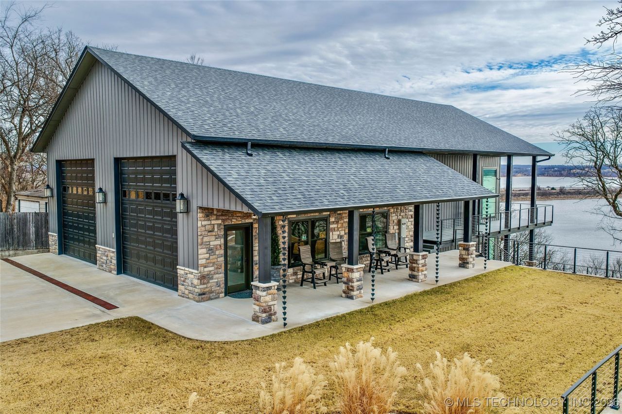 This Eufaula Lakefront home is truly one-of-a-kind! Step inside to find soaring vaults, hardwood floors, a 10'x35' wall of Pella glass with breathtaking views of the lake from this gorgeous 2023 custom built home. Included with the property are two lots with all utilities in place-a perfect place for an out building with pass through doors for additional lake toys! The location is within a 5 minute ATV drive to the town of Eufaula and the Eufaula Cove Marina and 10 minutes to Carlton Landing. This home is an entertainer's dream with quartz finishes and a chef's kitchen featuring high end cabinetry for the professional that includes a stunning butlers pantry. The island is the focal point of the open concept living area which includes a stunning living and dining area, fireplace with automated TV mount and window coverings. Also on the main floor, you'll find a bedroom designed for the kids in mind or kids at heart with built-in furniture. The lower-level owners suite boasts a large bedroom with breathtaking views, a sitting area, fireplace, wet bar and wine fridge and private bath with second laundry, offering a peaceful retreat with walkout access to the outdoor living area. This home offers the ideal blend of rustic appeal and modern comfort with attention to detail far beyond the norm. The home includes R40 closed cell blown insulation that encapsulates the living area and the huge garage includes R30 insulation,14' premium insulated doors and 20 blown insulation in the attic. The home was built for high efficiency & extreme Oklahoma weather and includes a 1000 gallon propane tank and 45KW generator. The outdoor area boasts over 2000 sq ft of outdoor living with an amazing view of the lake from a floating upper deck that transitions to an inviting stone and industrial accented entertainment area and irrigated lawn below. As mentioned, no detail was spared with this recent build! Call today to be provided a private showing of this one of a kind lake home.