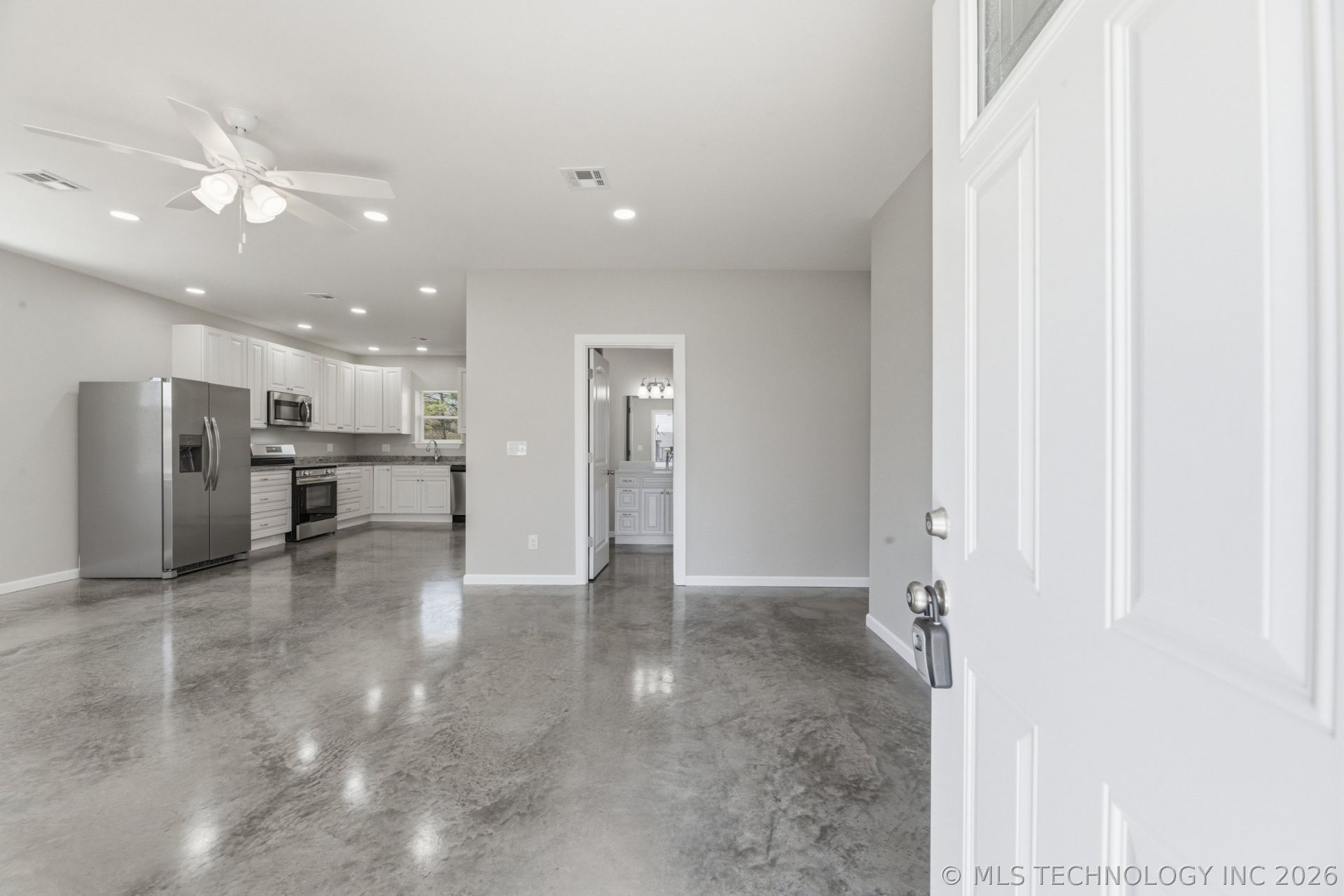 This home features-stained concrete floors, a beautifully crafted kitchen with custom cabinetry, lazy Susan, soft close drawers & cabinets, beautiful granite countertops, complemented by custom finishes throughout. Appliances include stainless steel refrigerator, stove, microwave, dishwasher, garbage disposal & washer & dryer making this home truly move in ready. This home is designed for comfort, style, & energy efficiency. The wrap around porch is the perfect place to relax, unwind and enjoy peaceful outdoor living. The driveway offers generous parking with room for a carport. Located on a quiet street with opportunity for a storage building and/or fenced yard. This home is close to shopping offering an incredible opportunity for eligible qualified buyers to take advantage of 0% percent down with USDA financing making homeownership more accessible.